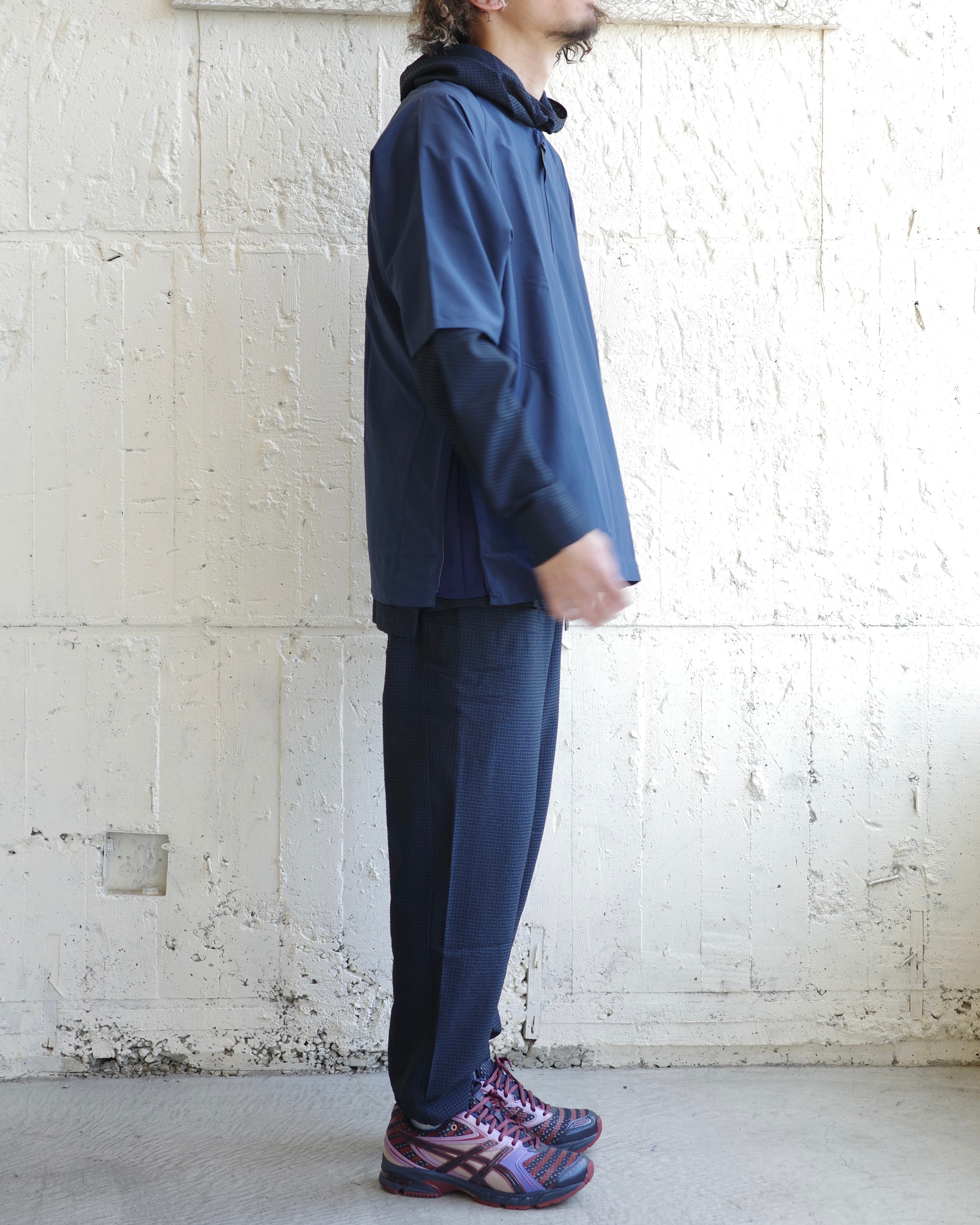 すっきりとしたノーカラー仕様のためカットソー、フーディー等、インナーを選ばない春先のライトアウターの最終形態。