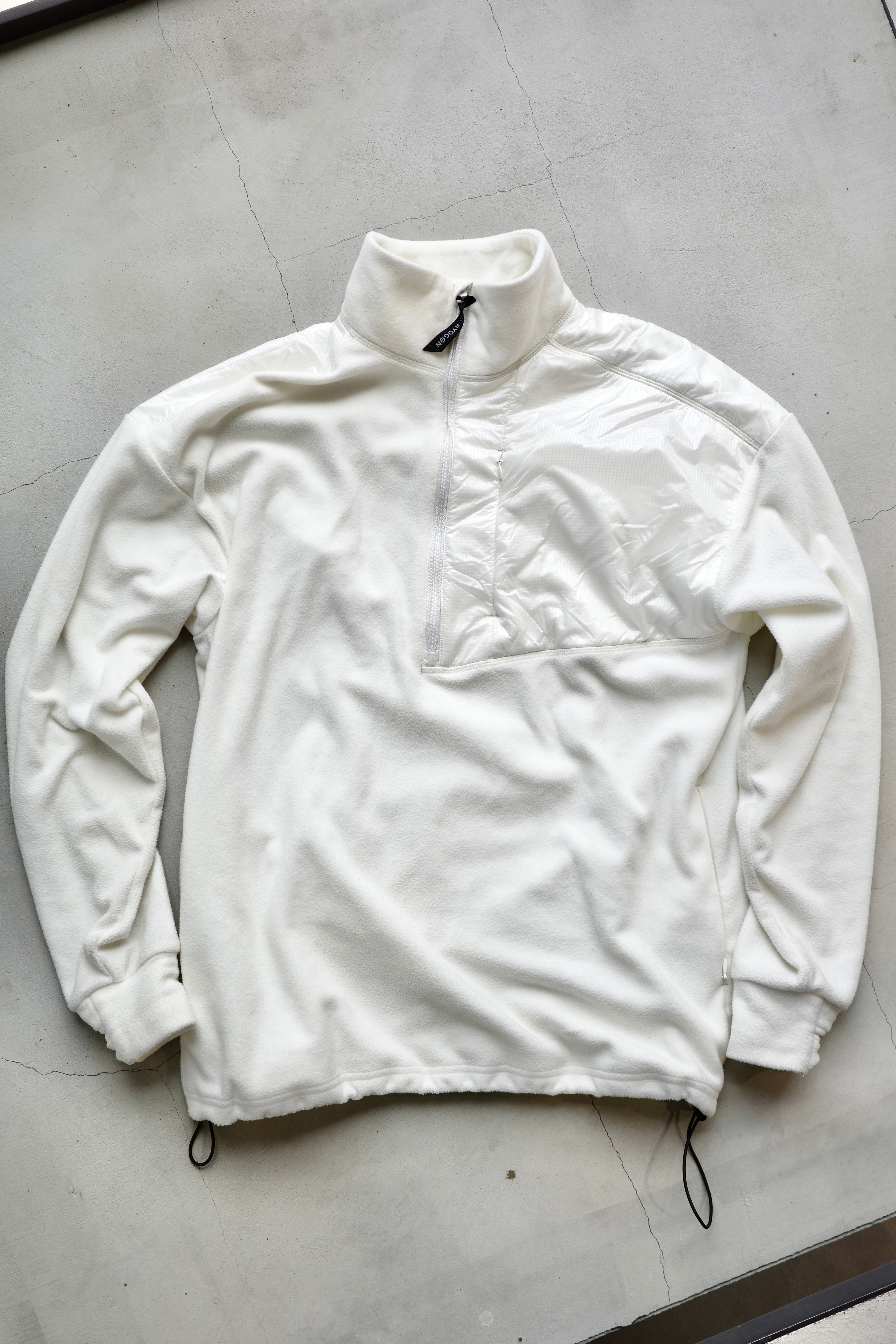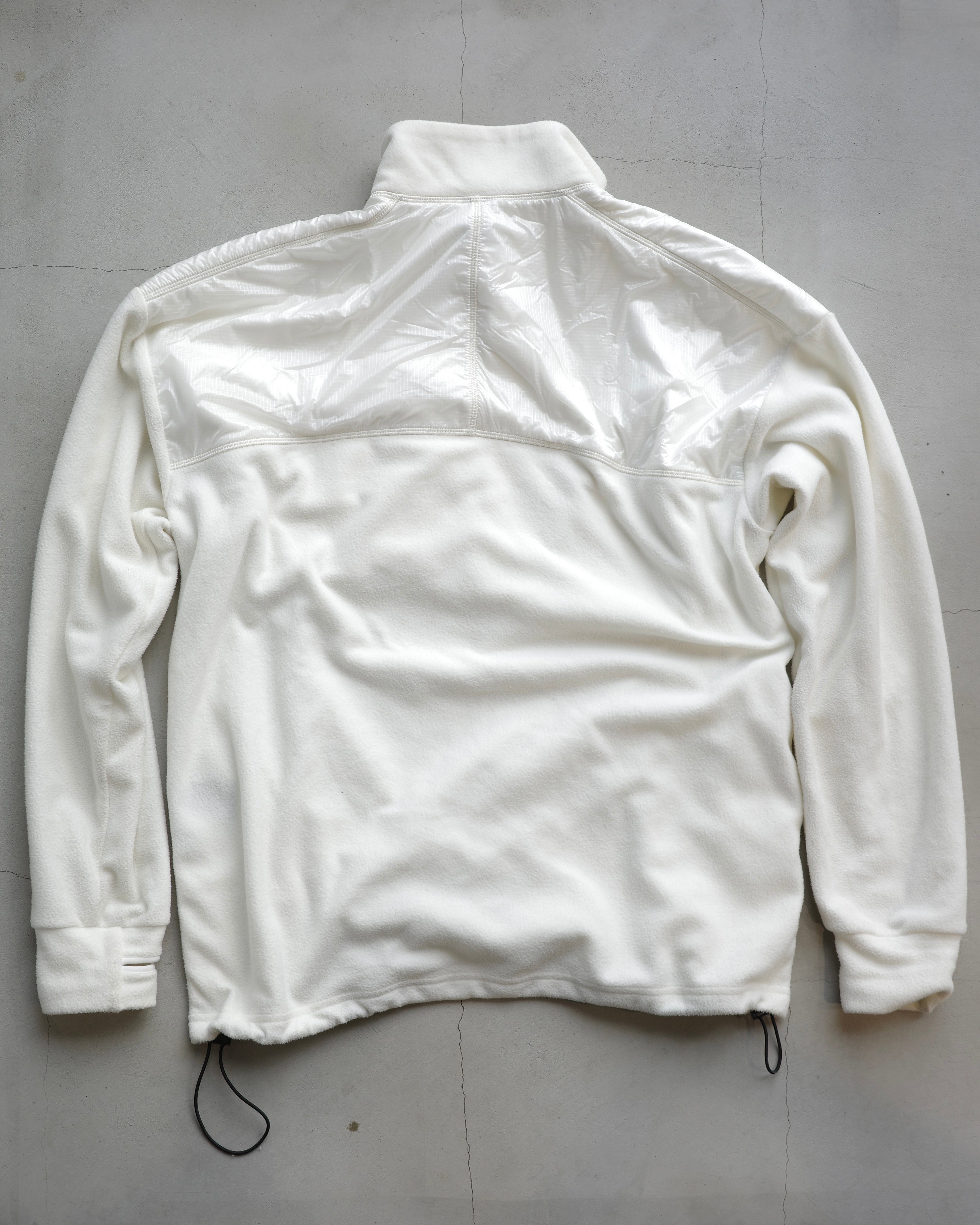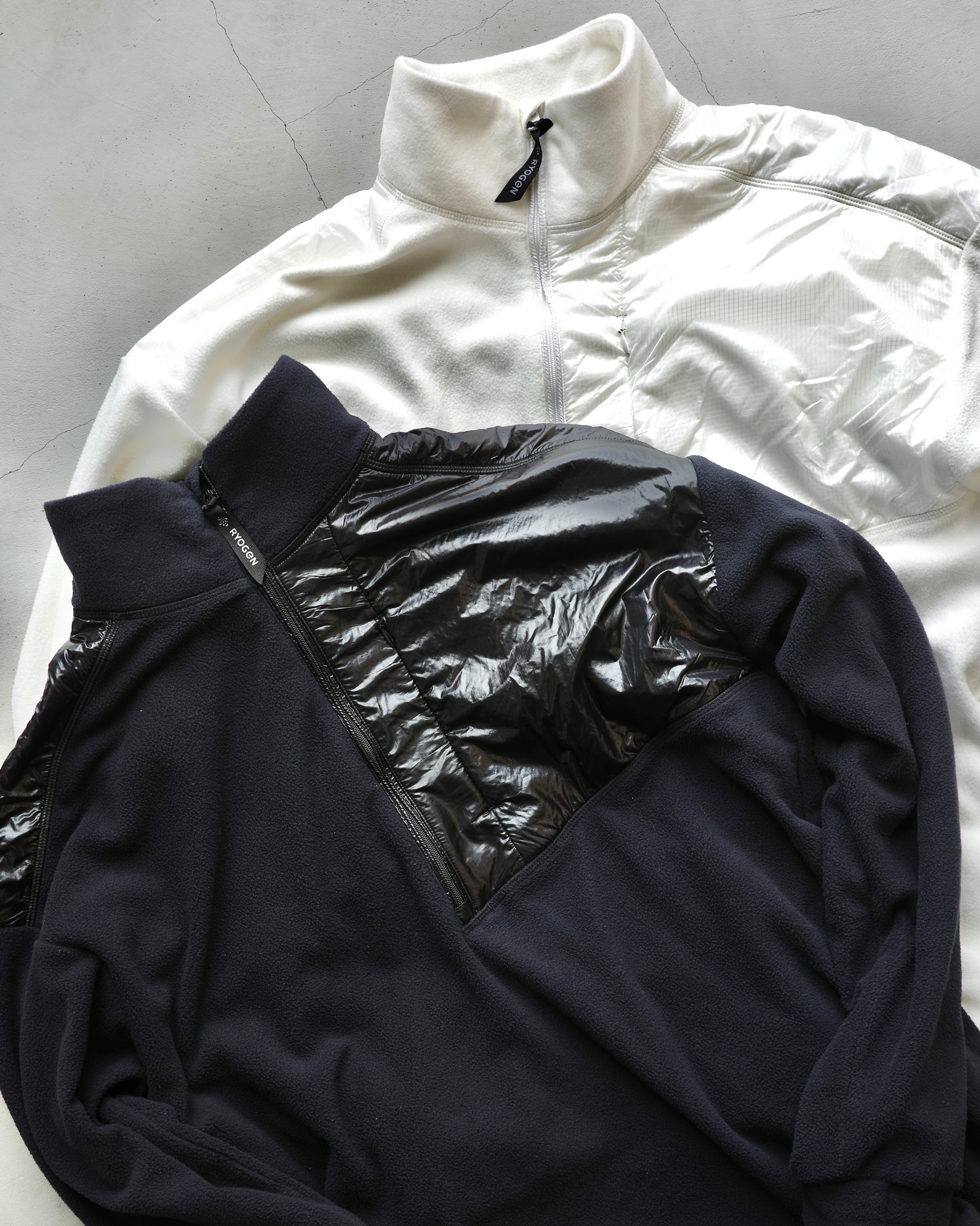 左身頃から肩にかけてナイロン素材で切り替えることで野暮ったいイメージのフリースにメリハリをプラス。