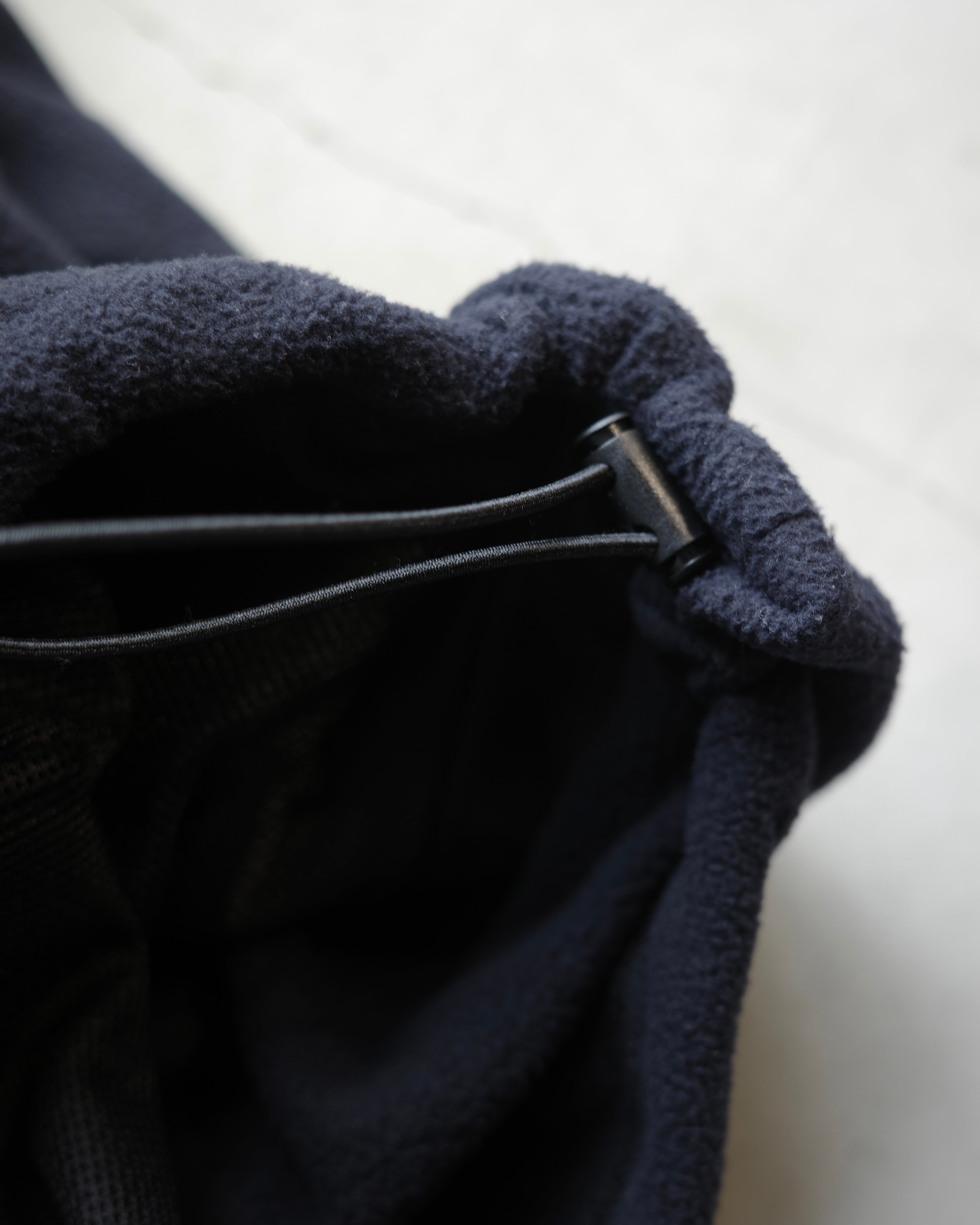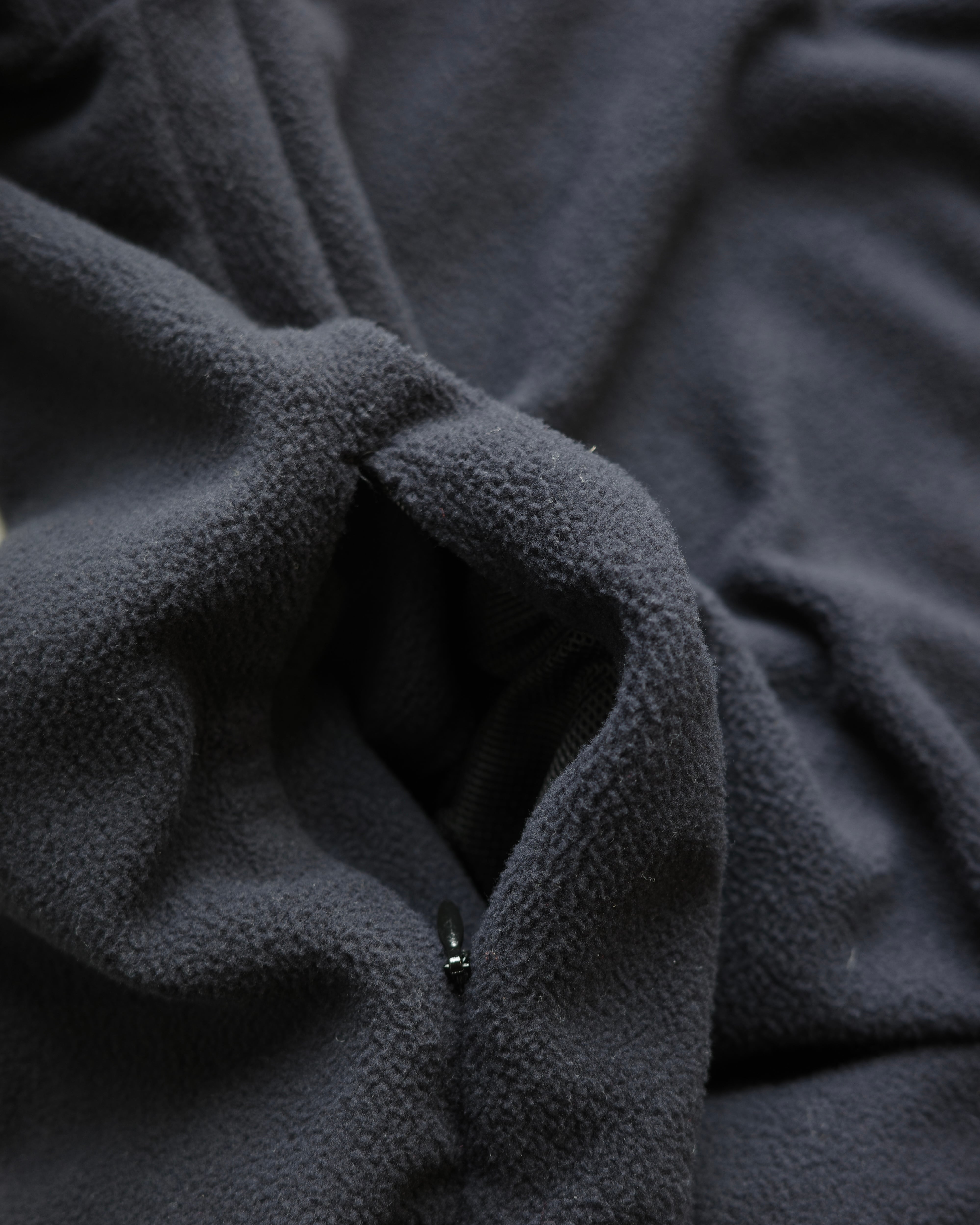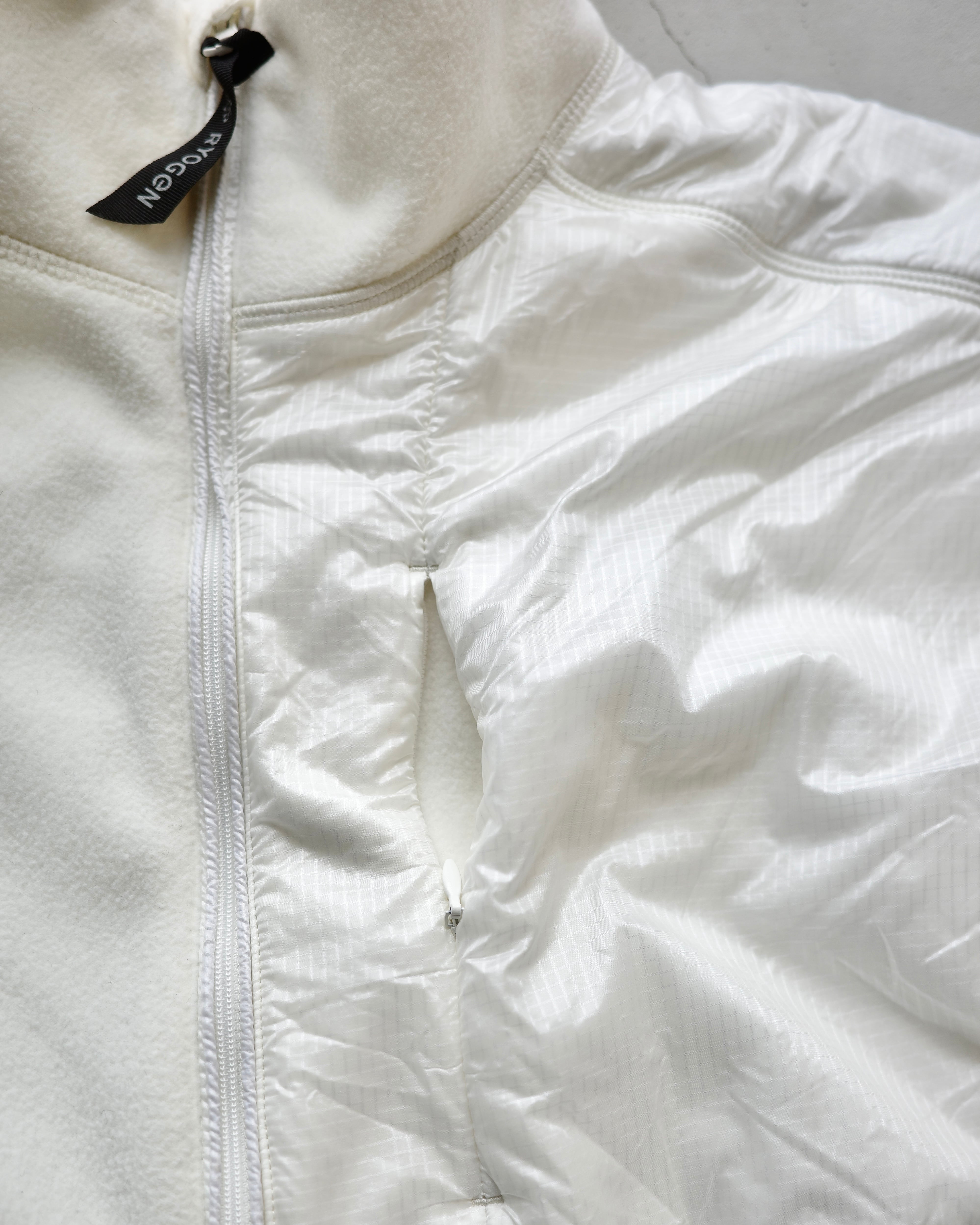 左身頃から肩にかけてナイロン素材で切り替えることで野暮ったいイメージのフリースにメリハリをプラス。